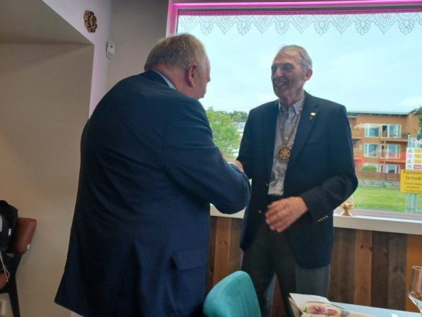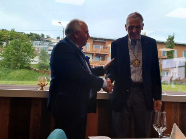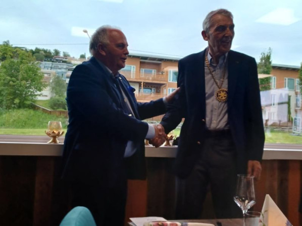 Avgående President Øystein overlater rotarykjede og klubbe til den nye Presidenten Mark for 2020/2021